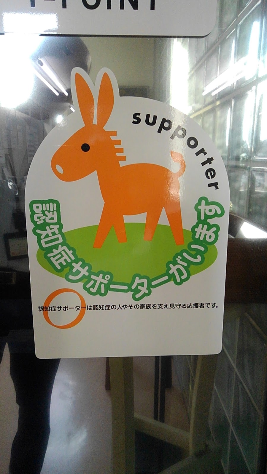 講習終了後は写真のステッカーを店頭に貼ってみなさんに認知症サポーター制度とサポーターがいることをお知らせしています。意識してみると意外と町のお店の入口でこのステッカーを見つけることができるかもしれません。制度自体はかなり以前からあって企業としての参画も多いです。