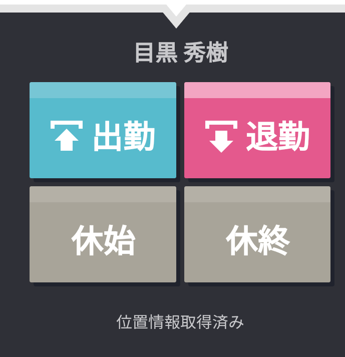 | トライアル中の私のスマホの勤怠入力トップ画面。 スマホのGPSで位置情報が自動で取得されます。 |