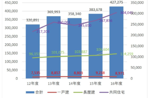 これが需要だとするともう一方の供給される側では賃貸に絞るとほとんどが共同住宅、いわゆるアパート、マンションで一戸建ては全体の3%にも満たないという統計が出ています。