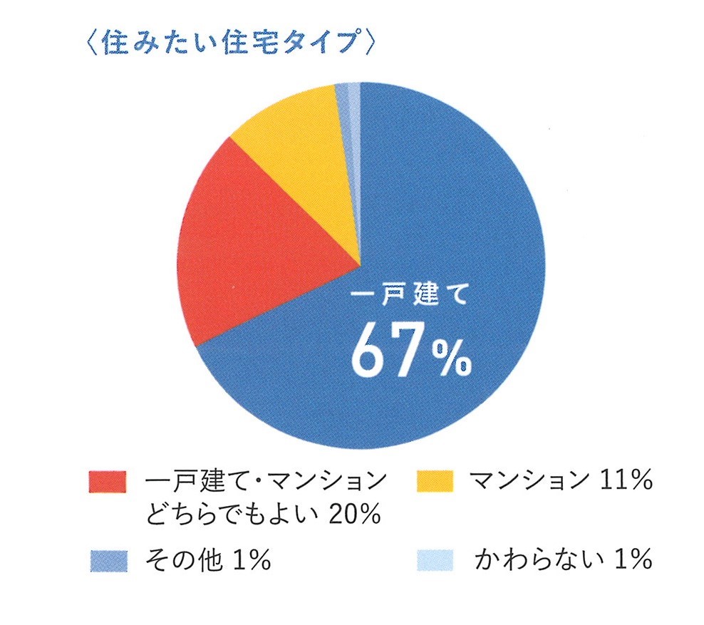 このグラフはとある住宅メーカーが行った「住みたい住宅タイプ」アンケートの結果です。地域による特性もあるので群馬だとさらに”一戸建て”の占める割合が大きくなるかもしれません。