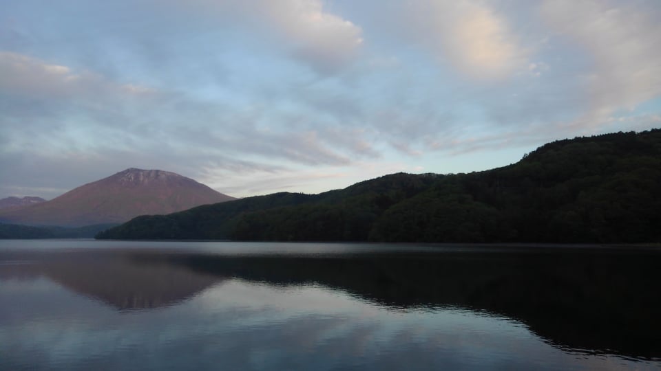 | 夜明けの静寂の野尻湖。アングラーのテンションMAXの瞬間です。 |