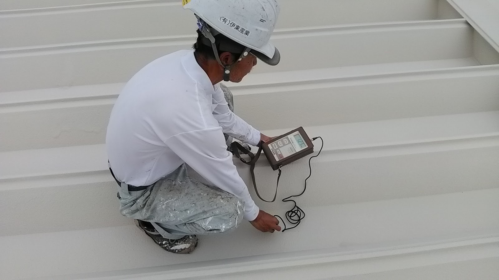 今週は1日だけ日中フルに晴れたのでその日を狙ってベースコートを施工することができました。当社イチオシの特殊遮熱はこのベースコートがキモなのでしっかり膜圧測定も実施しています。