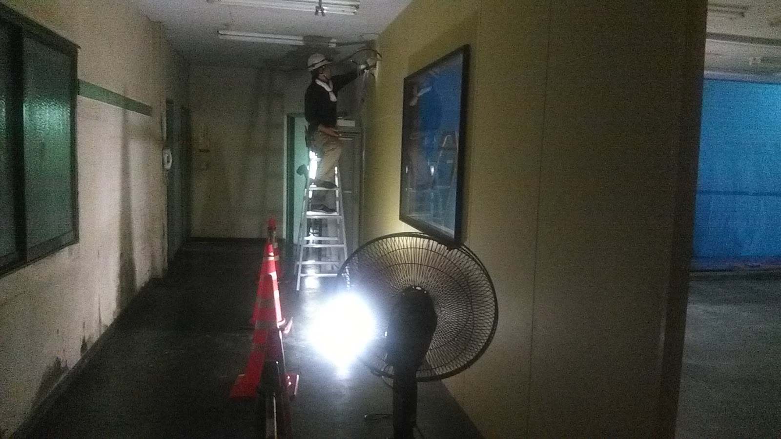 | 今日は今回の工事の山場。電気配線の廻し替えです。 停電真っ暗で空調無しなので工場扇を用意して熱中症に 注意しながら無事に作業を終えました。 |