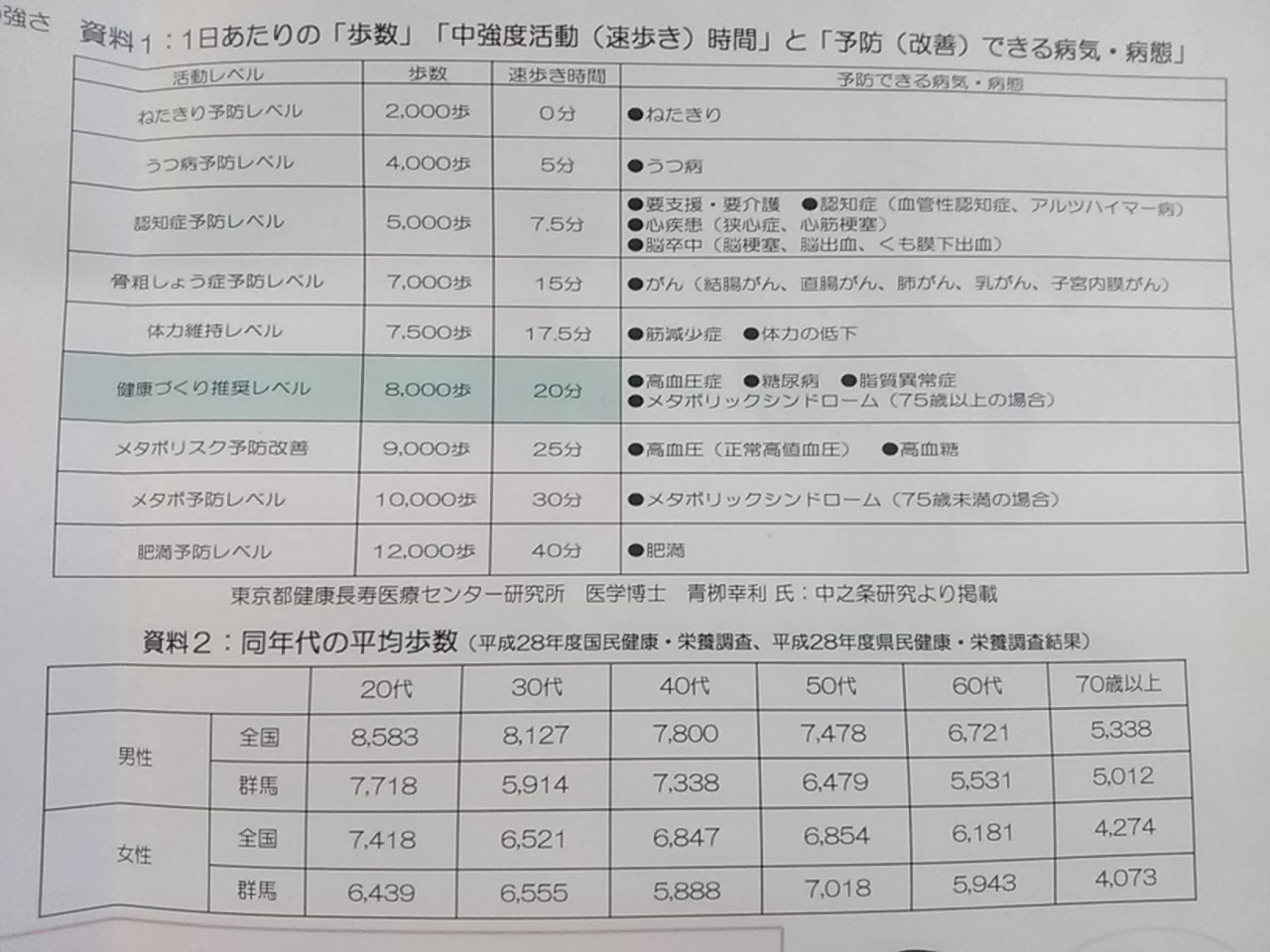 送られてきた資料で見ると、現在の活動量で予防あるいは改善できる病気は「寝たきり」から「うつ病」の間。。。。😨