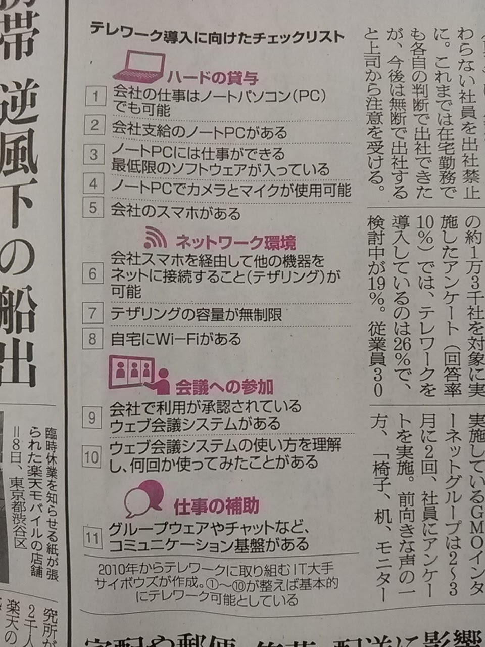 | 4月9日の朝日新聞から 「テレワーク導入に向けたチェックリスト」 当社の場合は4番の一部と7番の「テザリングの容量が無制限」 だけが当てはまっていませんがそれ以外は○でした |