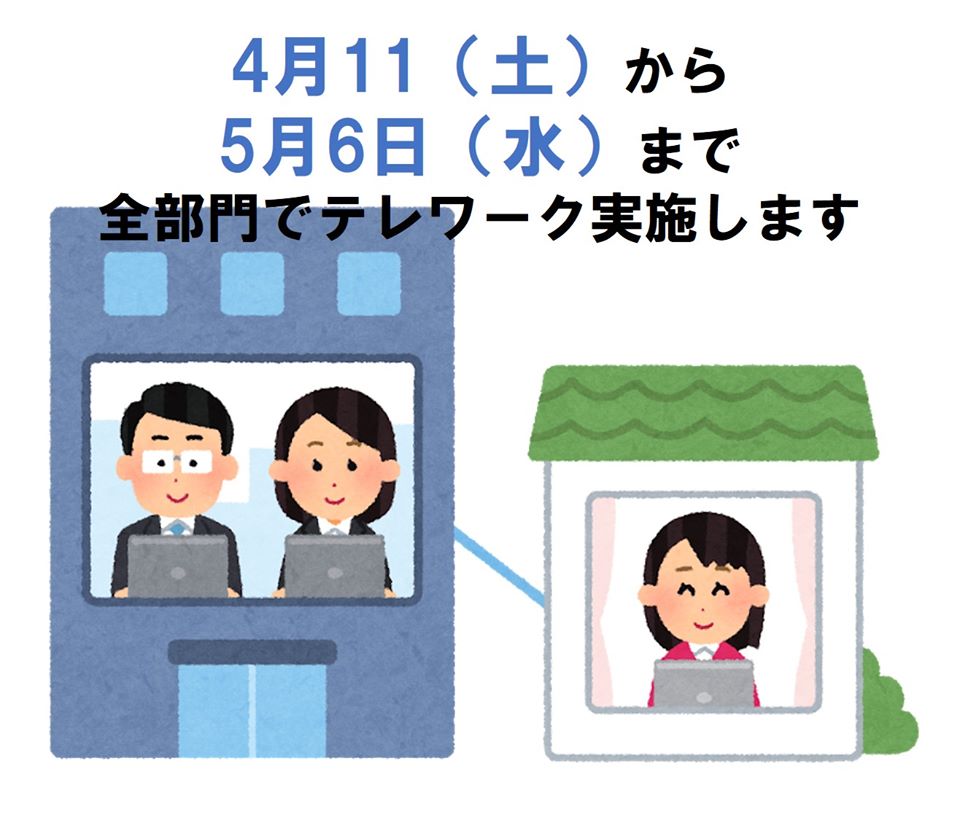 タイトルの通り、このブログでは2月末くらいから当社はテレワークの準備を始めていることを書かせてもらっていましたが当社も今日(11日)から来月5月6日をめどに本格的にテレワークを実施することにしました。