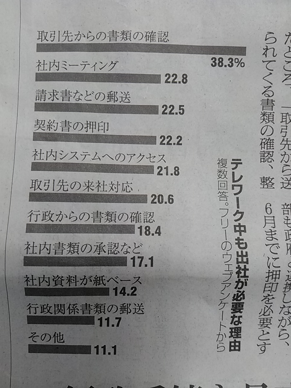 今のところ答えはYES。これについては24日付けの朝日新聞にアンケート結果が掲載されていましたので出社必要な事例についてはこれに譲りますが対取引先、対金融機関、対行政などの文書のやりとりは我々の一存では変えられないのでこれを機に世の中全体が脱ハンコ文化へと商習慣が変化することを期待しています。出社が必要な部門、業務を担当する人はそれだけでリスクが高いことになりますので。
