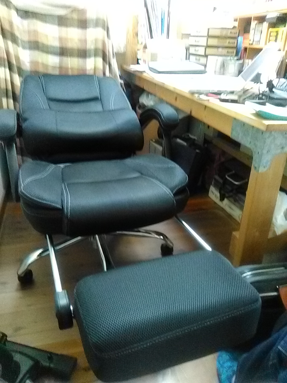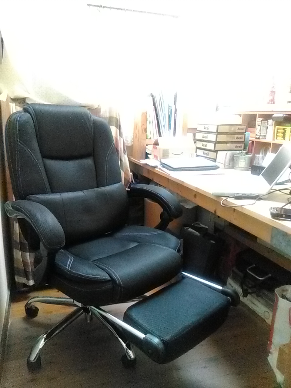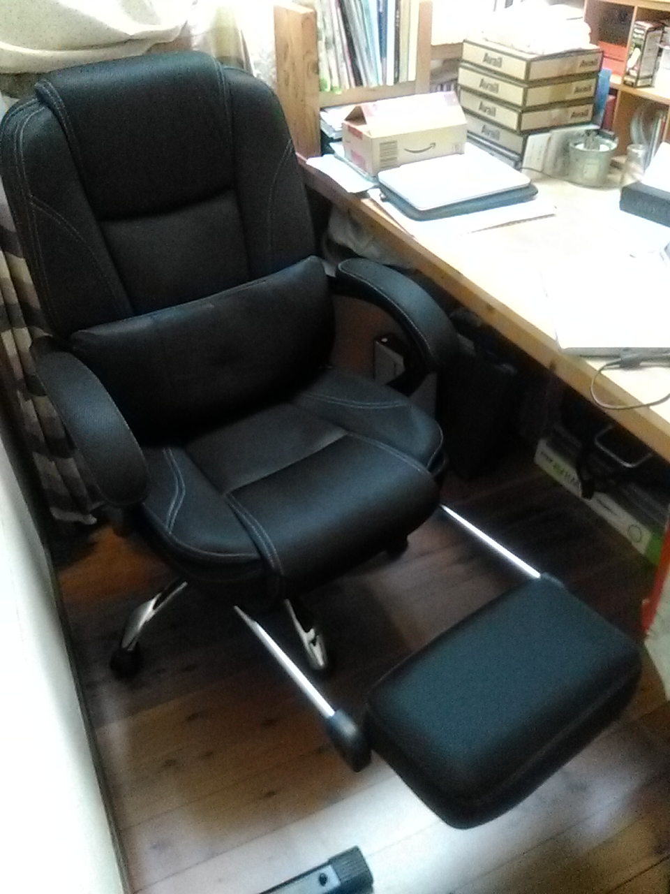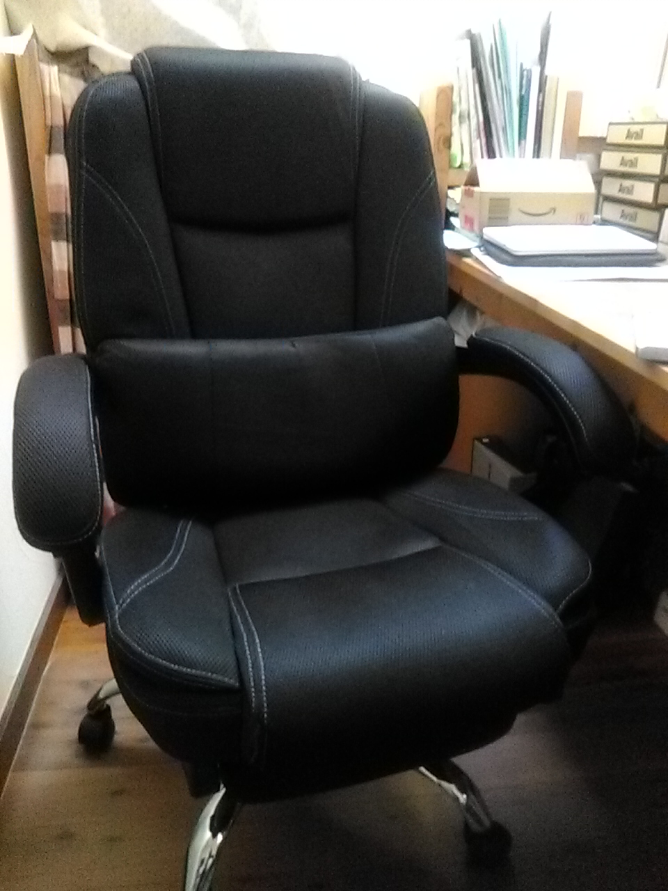 私は昔から家でもついつい仕事をしてしまう古いタイプの悪しき習慣を持っていたので書斎にはビジネスチェアを使っていました。写真は3代目(?)で先代は予算をケチって本革ではなくフェイクレザーにしたところ時間の経過とともにボロボロはがれてきて、家人に「掃除する身にもなってよね”(-“”-)”」と怒られ現在のメッシュタイプに至りました。
