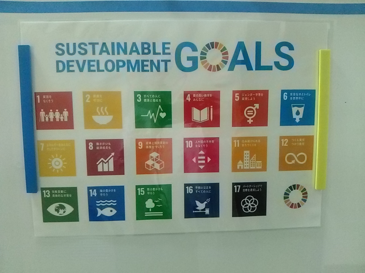 当社は今期SDGsの取組始めますよというのは以前書かせてもらいましたが、何をどう始めるんだという話でまずは自社がSDGsに取り組んでいることを社員が意識するようにということで掲示板にロゴを掲示しました。