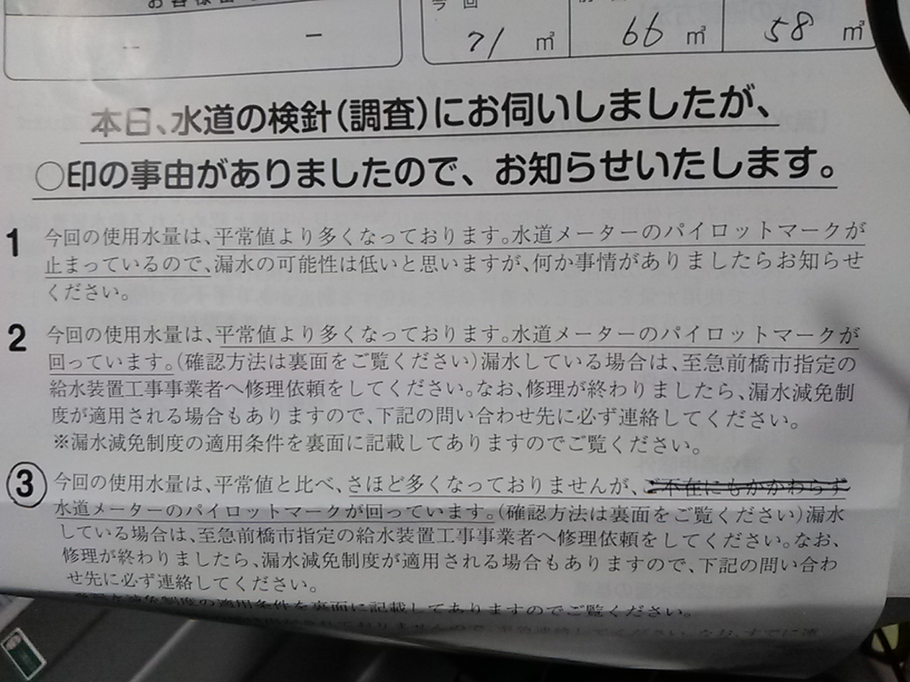 ちなみに今回の騒動には前兆があって、直前の水道の検針ですでに水漏れの疑いが指摘されていたのです。なのでもし皆さまのご家庭で検針時にこのような紙が入っていて、水漏れの思い当たるフシが無い場合は外の給湯器を一度点検してみてください。修理費は変わらないかもしれませんが事前に部品を用意して修理日を確定しておくことで”熱湯バケツの刑”は避けることはできます。