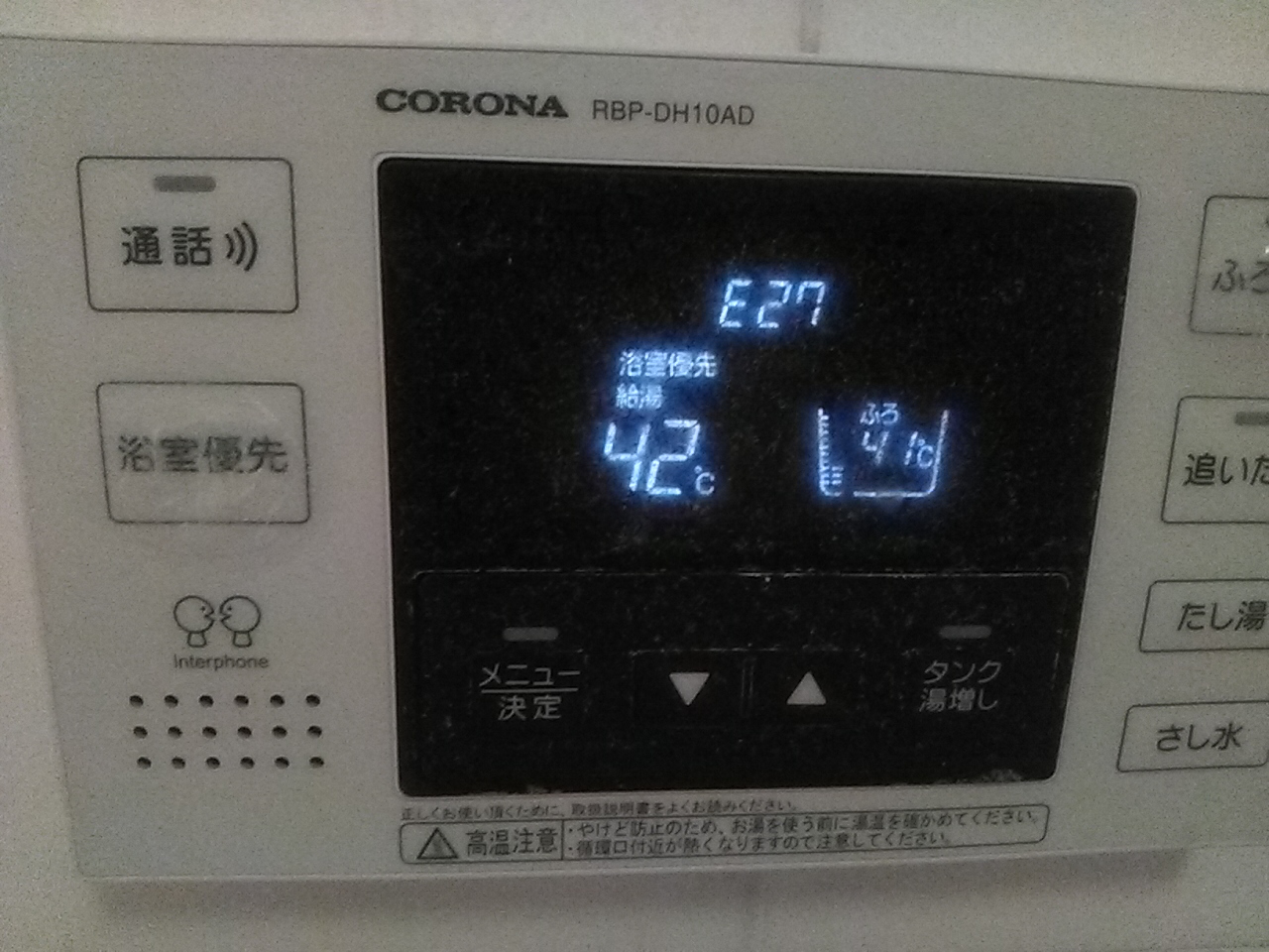 それはちょうど先週の木曜日の深夜。「風呂場からなんかピピピッって鳴ってるよ」と声が。家人は「食洗器回すのに”お湯足し”しようとしたらちょうど鳴っただけであたしゃ何もしてないよ!」と早くも無関係を主張。表示されるアラートは「E27」。取説あったっけなーと探していると下の子がスマホで先に調べて「通信エラーだって」と。