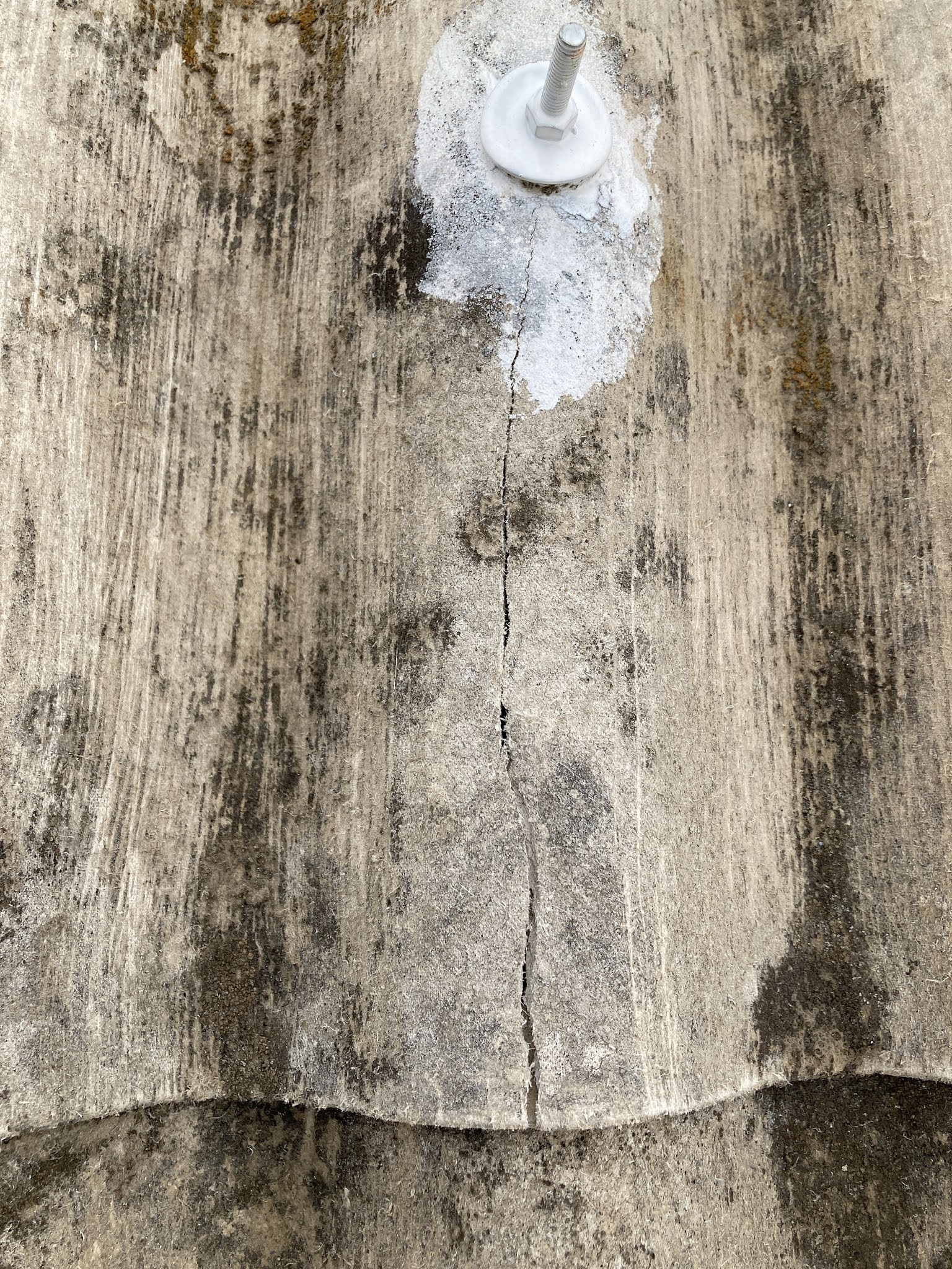 | きれいにすると見えなかったひび割れも見えてきます。 フックボルトもキャップの前にまず錆止め |