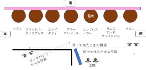 外から帰って来た時に奥まで大きな青系の葉が並ぶ姿が楽しみです。