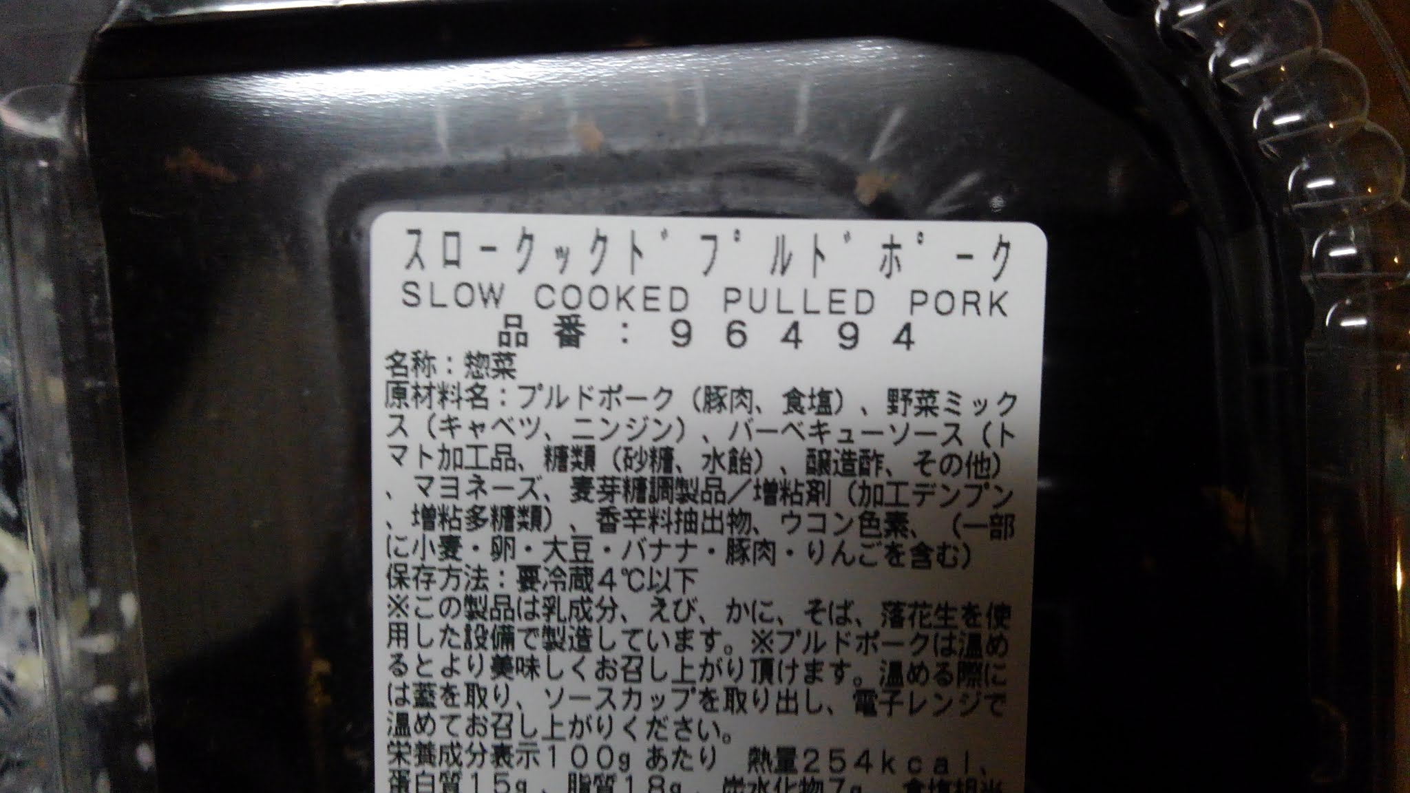 その商品名は「スロークックド プルドポーク」。馴染みのない方たちには「なんやなんや??」という名前ですが中身は「チョップドポーク」と「コールスローの一歩手前ぐらいに刻んだサラダ」です。それにバーベキューソースがついてます。