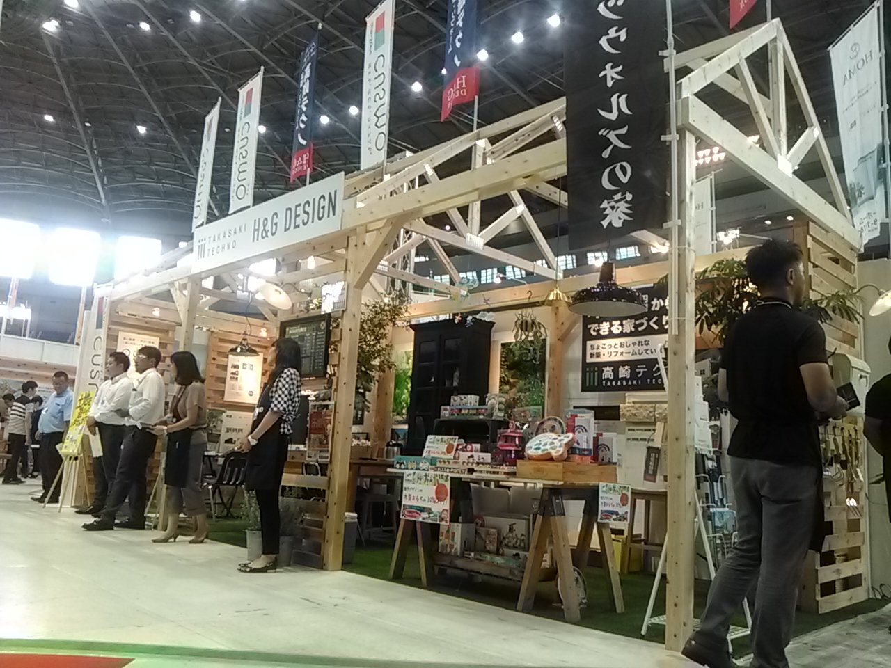 ツーバイフォーフレームをお願いしているアールフレイム様の協力でトラス屋根を載せました。おかげさまで出展者の中では一番背の高いブースとなってのぼりも目立っています。