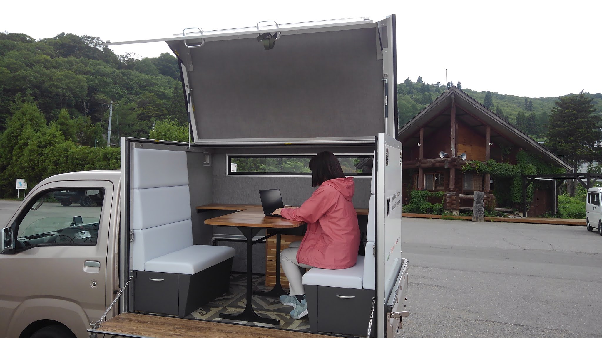 聞くと野尻湖のある信濃町と接しているお隣の新潟県妙高市の駅前レンタカー屋さんがダイハツと共同で妙高市活性化のために開発した「モバイルワークステーション」。中でモデルとしてパソコン打ってるのは市役所の方だそうです( ´艸`)