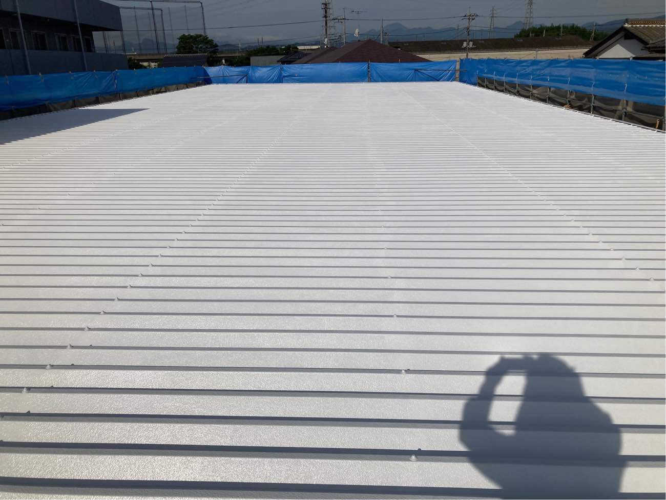 トップコートを施工後は屋根の表面温度はMax気温プラス5℃ぐらいにしか上がらないので屋根の上にいても俄然涼しく感じます。工場内の作業者の方からも「同じ気温でも今までと違ってムっとする感じが無いね」とすぐに効果を体感していただけました。遮熱=熱線の反射率が高く眩しい(晴れると目が開けていられないくらい)のでトップコートの工程では私はいつも釣りで使っている偏光グラスを着用しています。偏光グラスの良いところは肉眼ではわかりづらい塗装ムラが偏光によって発見しやすいこと。趣味の釣りアイテムが塗装の仕上げ確認に重宝しています。